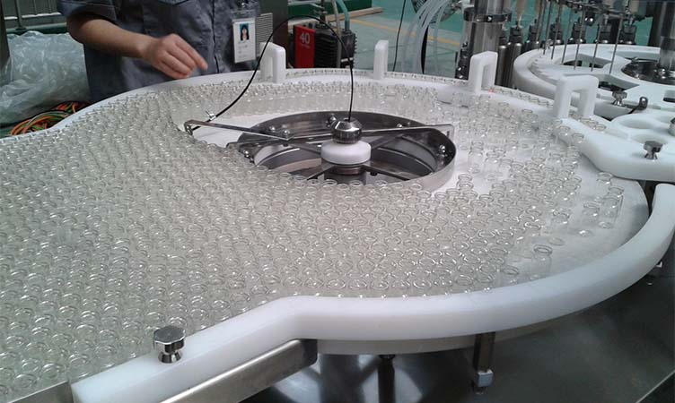 The machine can be used independently or used in combination with a vertical ultrasonic vial cleaning machine and vial sterilizing dryer to form a production line.